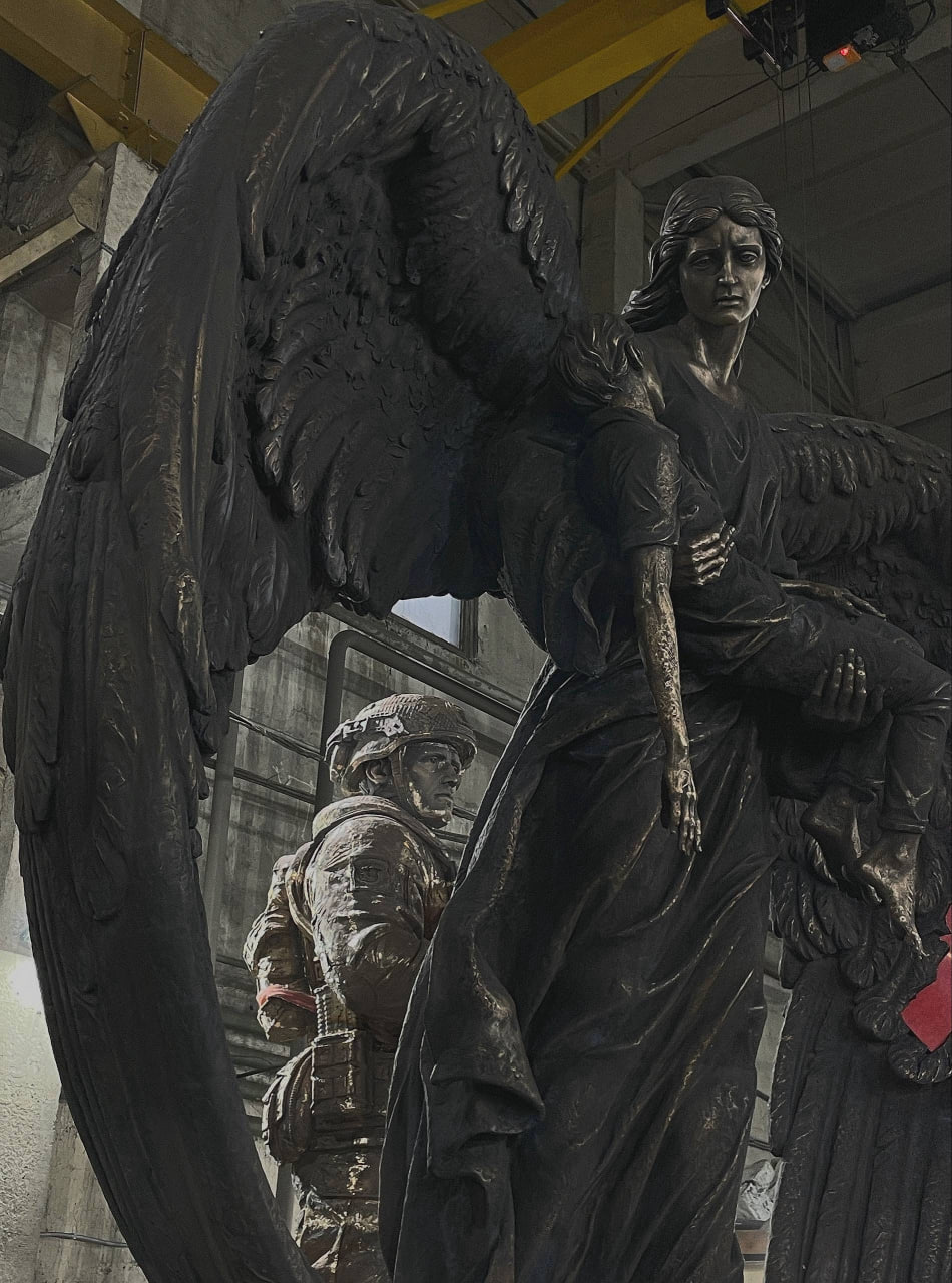 Высота бронзового мемориала – пять метров, а вес – около четырёх тонн. В его центре – ангел, бережно держащий ребёнка. Крылья скульптуры образуют форму сердца и покрыты ранами.