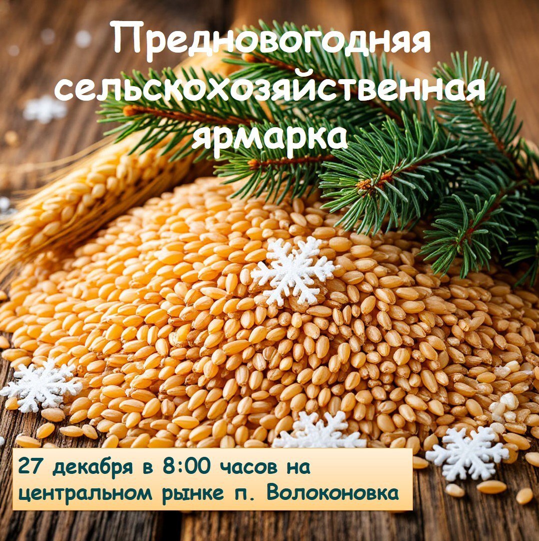 27 декабря в 8:00 часов на центральном рынке посёлка Волоконовка состоится «Предновогодняя сельскохозяйственная ярмарка» по реализации зерновой продукции.