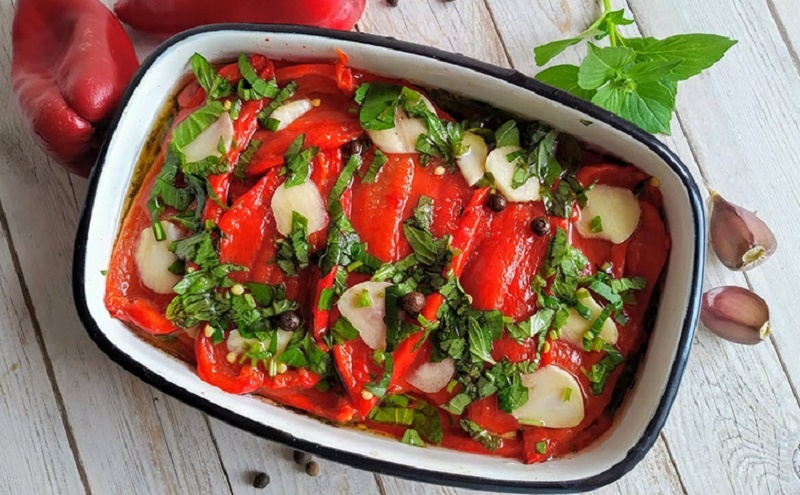Когда перцы готовы, их вынимают из сковороды, дают немного остыть, снимают кожицы и нарезают вдоль или пополам. Украшают заправкой из зелени и чеснока и оставляют в холодильнике на несколько часов для насыщения вкуса.