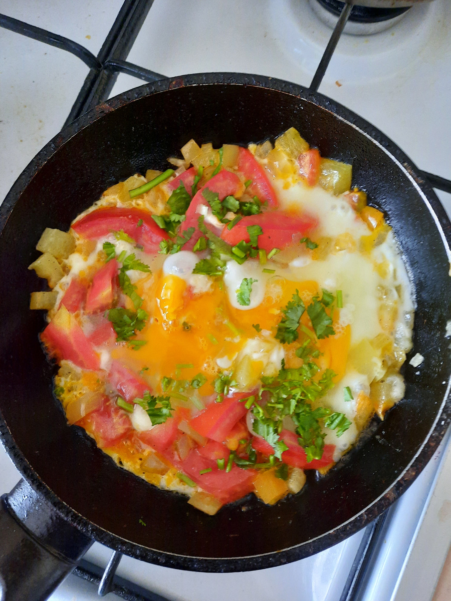 - Ингредиенты: 1/4 луковицы, 1/4 болгарского перца, 1/2 помидора, 1-2 яйца.