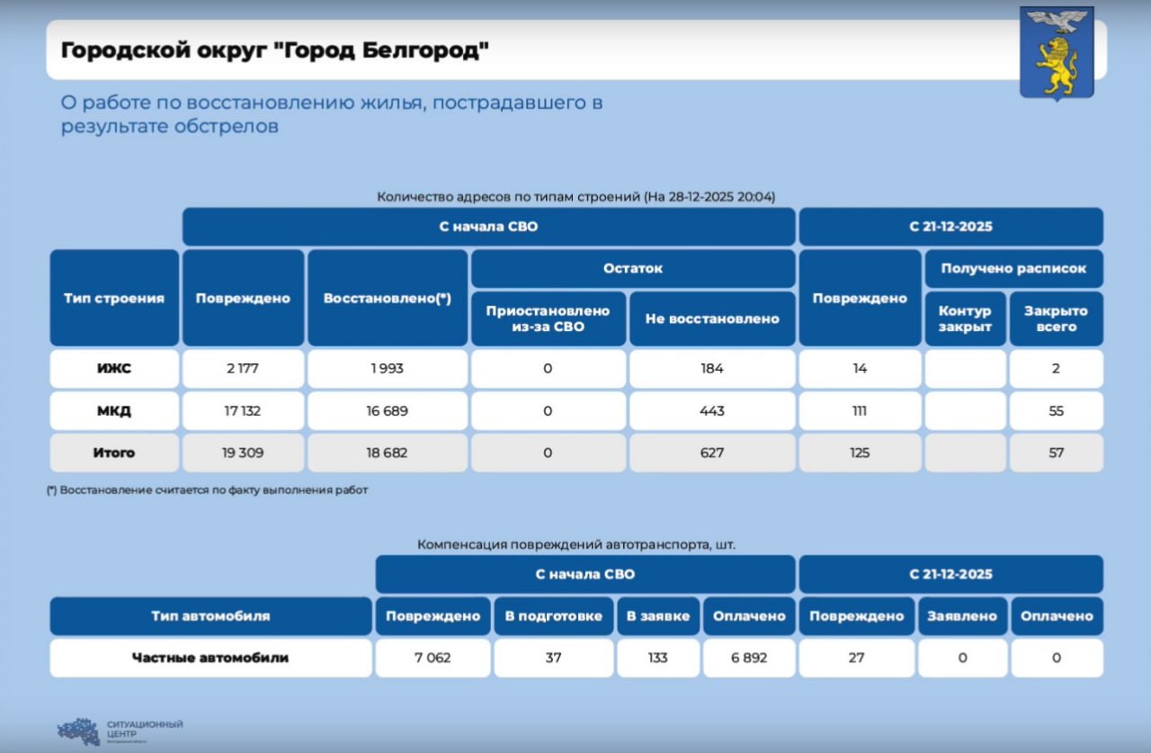 За этот период в Белгороде выявлены повреждения 27 автомобилей. Всего в работе у экспертов остаётся 37 транспортных средств. В планах завершить оценку повреждений этих автомобилей до 11 января 2026 года.