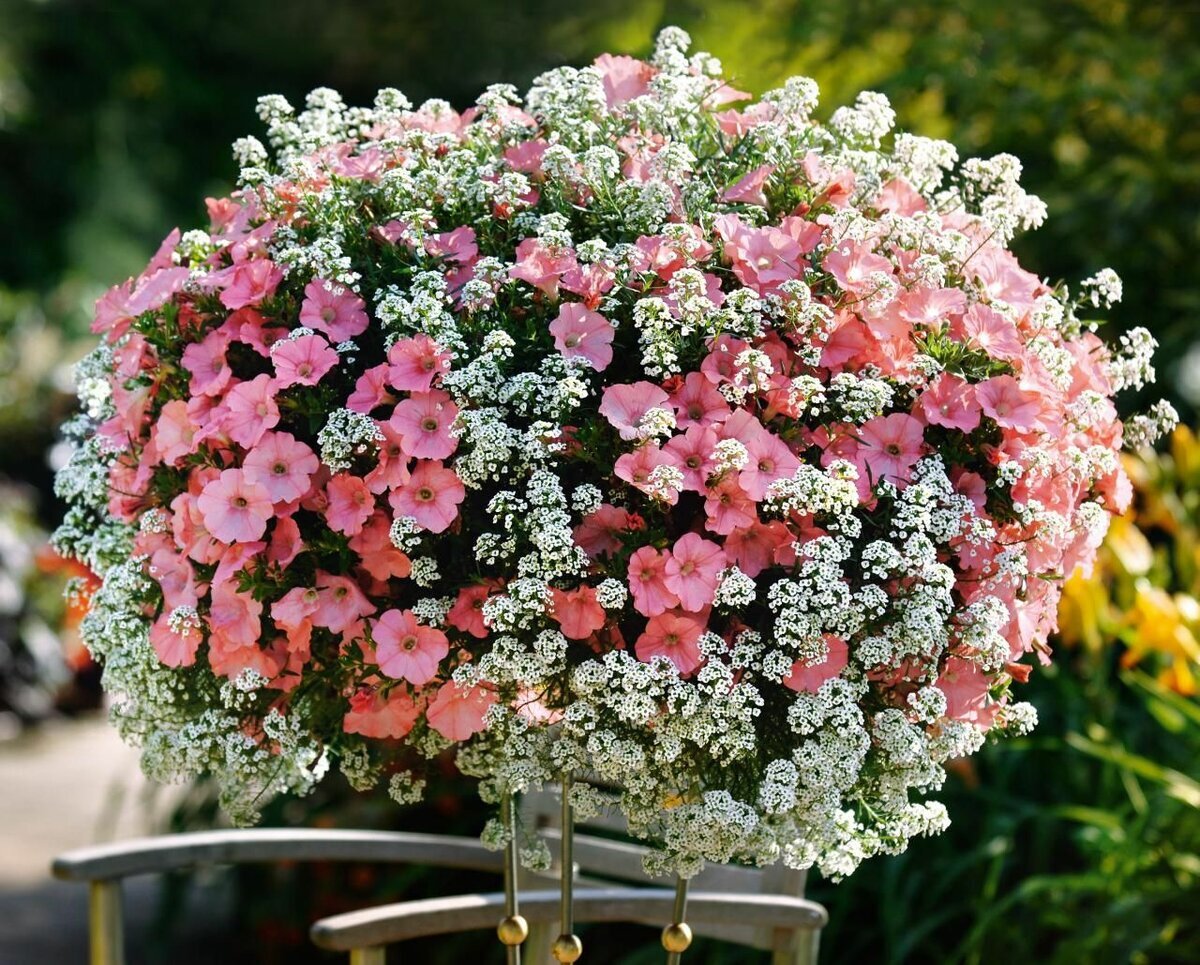 Этот растение прекрасно дополняет петунии, заполняя пространство множеством мелких цветов. Алиссум и петунии легко формируются и великолепно смотрятся как в открытом грунте, так и в кашпо. Все сорта алиссума отличаются продолжительным и обильным цветением, что делает их идеальными партнерами для постоянных петуний.
