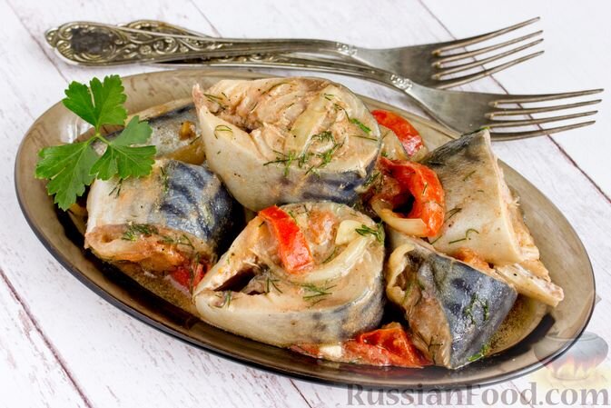- Скумбрия, маринованная с помидорами - благодаря яркому маринаду с соевым соусом и свежей зеленью, её вкус становится ещё более насыщенным.