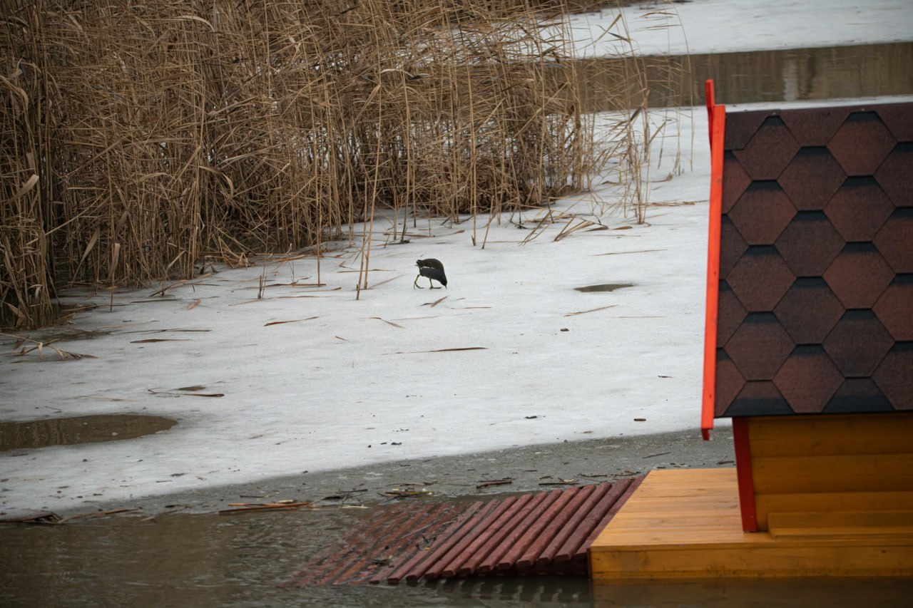 Его уютный домик в камышах стал настоящей птичьей «гостиницей» этой зимой. Сюда с удовольствием наведываются водяной пастушок, камышница и лысуха.