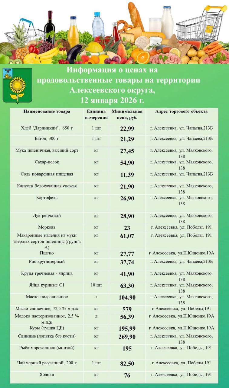 Представляем вашему вниманию обновлённый перечень минимальных цен на продовольственные товары в городе Алексеевка.