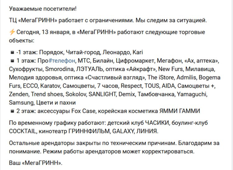 Некоторые точки в торговых центрах закрыты по техническим причинам.