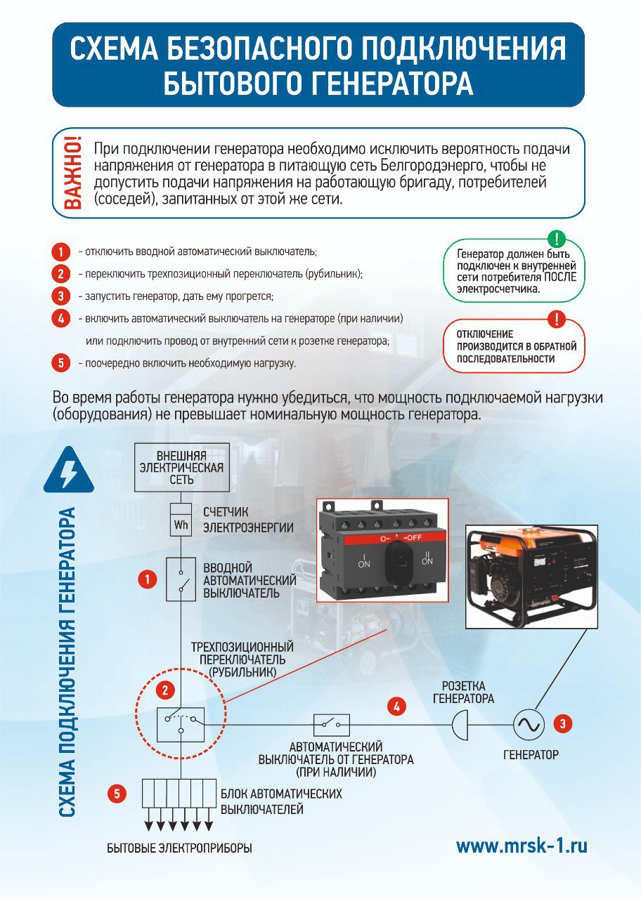 Филиал «Россети Центр» – «Белгородэнерго» напоминает потребителям, устанавливающим индивидуальные дизельные и бензиновые генераторы, что подключать их нужно чётко в соответствии с инструкцией и обязательно ПОСЛЕ электросчётчика. Это необходимо для того, чтобы исключить электроэнергию, выработанную генератором, из расчётных платежей.