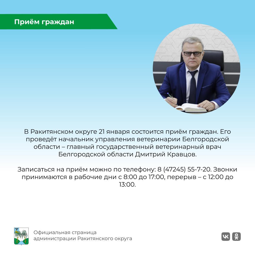 21 января в 10.00 в Ракитянском округе состоится приём граждан. Его проведёт начальник управления ветеринарии Белгородской области – главный государственный ветеринарный врач Дмитрий Кравцов.
