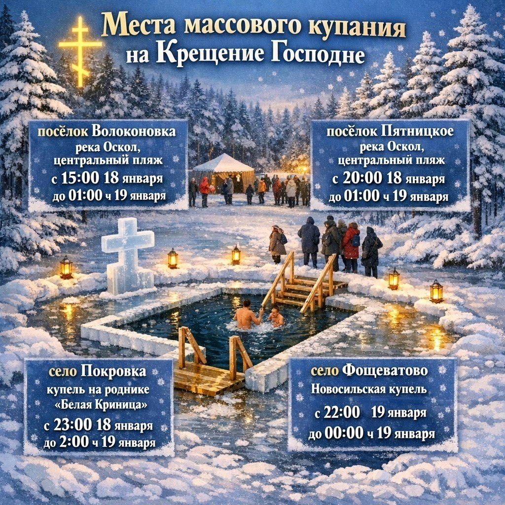 Традиционно в ночь с 18 на 19 января на территории нашего округа будут оборудованы специально подготовленные места для совершения процесса омовения святой водой, где будут дежурить медицинские работники, сотрудники МЧС, полиции и ДНД.