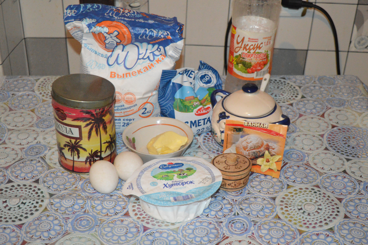 В первую очередь подготовьте все ингредиенты. В глубокой миске соедините яйцо, сахар и соль, тщательно перемешивая. Затем добавьте размягченное сливочное масло и сметану. Понемногу засыпайте муку, после чего погасите соду уксусом и введите в тесто. Замешивайте до однородной массы и дайте тесту настояться 15 минут.