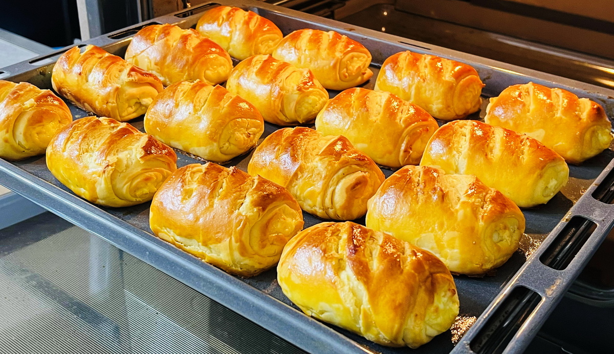 После того, как тесто увеличится в объеме, следует его разделить на 8 равных частей, каждую раскатать в круг. Затем, намазывать их маслом, складывать пополам — получится 16 слоев. Далее к каждой заготовке добавляют начинку и сворачивают в рулет. Перед выпечкой рулеты нужно положить на противень, смазать желтком и сделать на поверхности три небольших надреза.