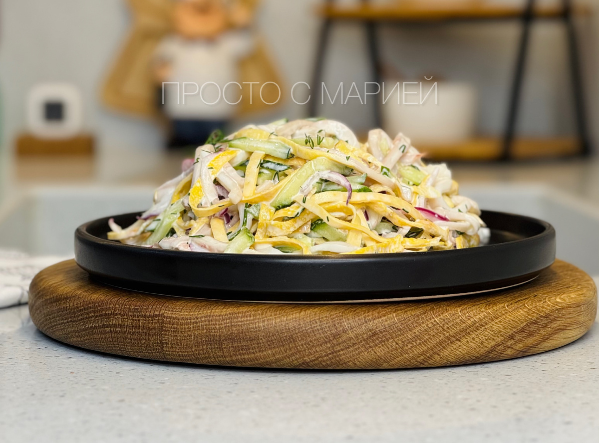 4. Кальмары отварить или ошпарить кипятком, после чего очистить и нарезать. Также нарежьте огурцы, убрав семена, если они водянистые.