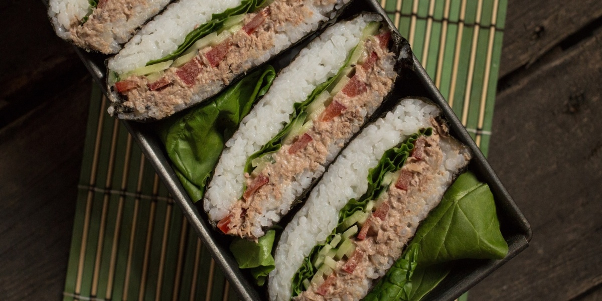 Пошагово это работает так: готовите рис, смешиваете тунца с майонезом и соевым соусом, подготавливаете овощи и зелень; на нори раскладываете квадрат риса, кладёте начинку, снова добавляете рис и закрываете конвертом. Затем — заворачиваете в пленку и оставляете на 10 минут, после чего режете и подаете.
