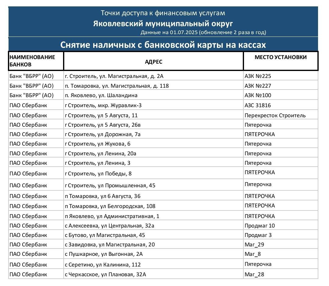Отделение по Белгородской области Главного управления Центрального банка Российской Федерации по Центральному федеральному округу в рамках повышения доступности финансовых услуг информирует жителей региона о наличии и местоположении точек доступа, в которых можно получить финансовые услуги.
