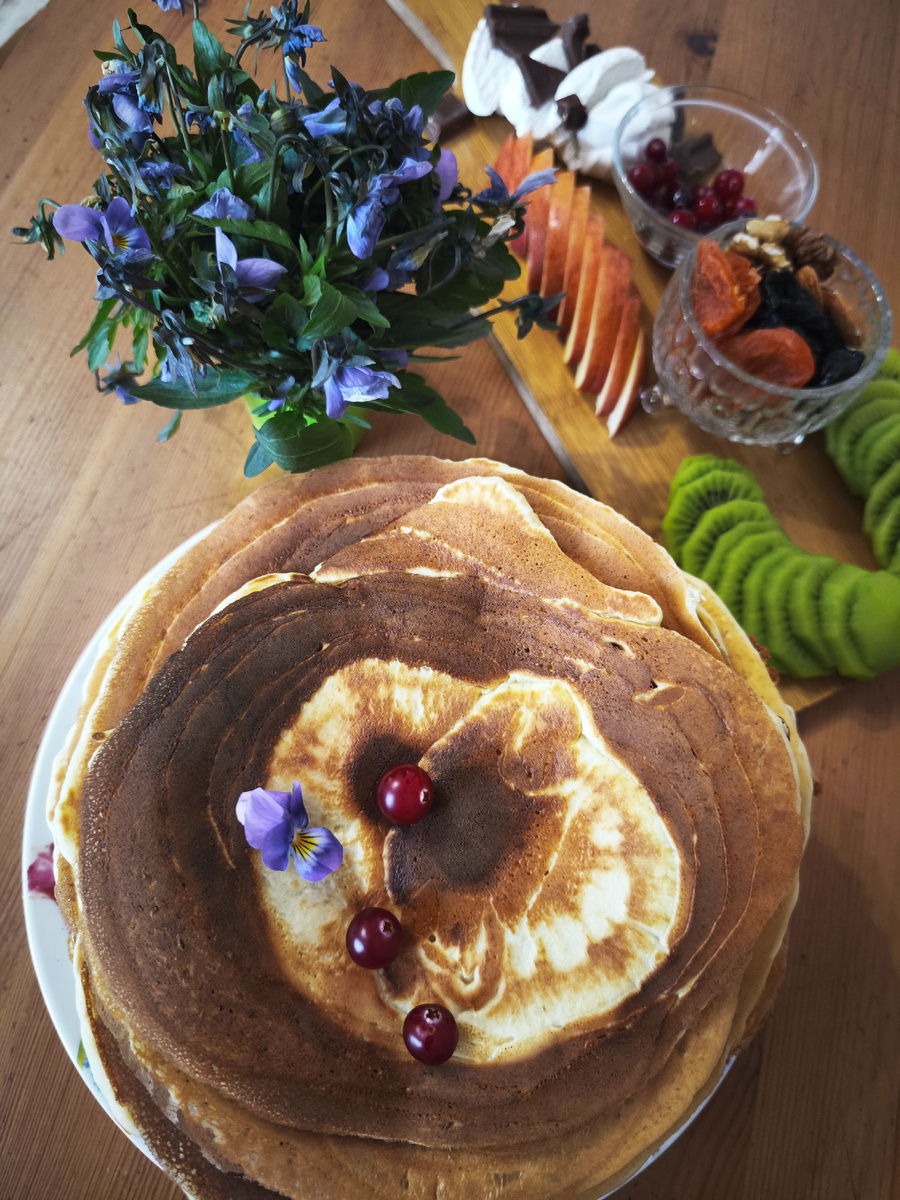 Подача проста: ягоды, фрукты, йогурт, сметана, варенье или сироп — всё, что найдется. Холодные панкейки сохраняют текстуру, если слегка подогреть их в микроволновке. Это блюдо хорошо работает и как основа для сладких сэндвичей, если понадобятся альтернативы завтраку.