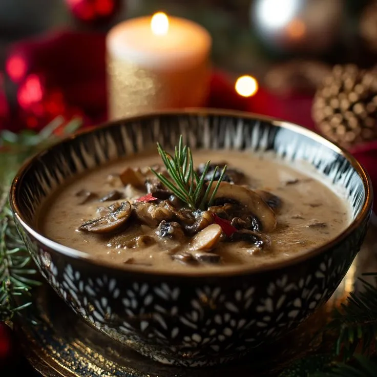 Подача проста: горячий суп разливают по тарелкам, сверху посыпают зеленью. Это начало рождественского ужина, которое задаёт тон всему вечеру и напоминает о дарах природы.