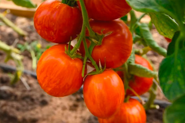 Кусты этого томата среднерослые и компактные, формируются как детерминантные. Плоды — округлые, зелено-золотистые при созревании, зрелые — ярко-красные с золотистыми полосами. Вес каждого плода обычно в пределах 140–200 граммов, что делает их удобными для салатов и хранения. На главном стебле формируется около семи кистей, в каждой — по шесть-семь плодов.