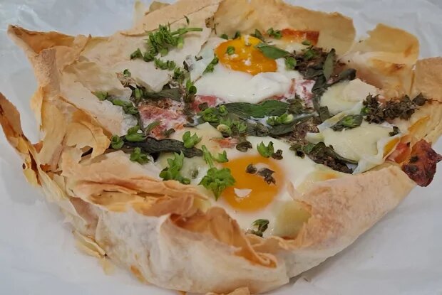 Плотно, но не герметично накрывают пергамент; сверху разложенную брынзу отправляют в духовку при 180 градусах до того, как яйца станут гладкими и кремовыми.