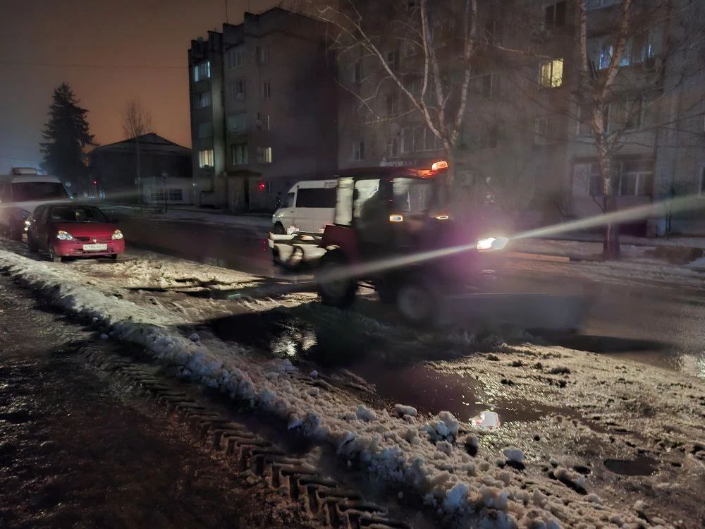 Основные усилия вчера были сосредоточены на ликвидации последствий потепления. Чтобы не допустить образования опасной колеи, дороги тщательно очищали от мокрой снежной каши вплоть до асфальта. Параллельно велась уборка тротуаров.