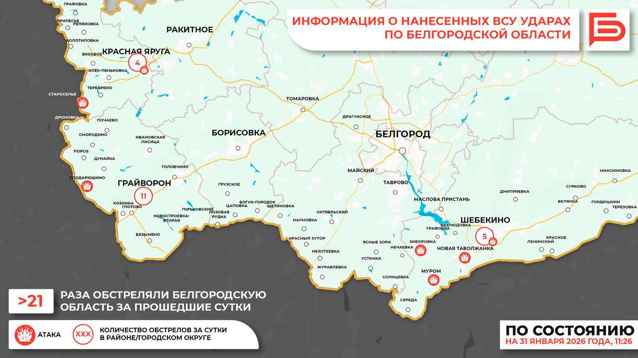 За прошедшие сутки ВСУ обстреляли Белгородскую область не менее 21 раза