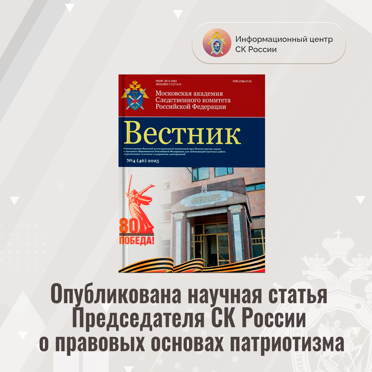 В свежем выпуске журнала «Вестник Московской академии Следственного комитета Российской Федерации» за 2025 год опубликована значимая научная работа Председателя СК России, заслуженного юриста и доктора юридических наук, профессора Александра Ивановича Бастрыкина.