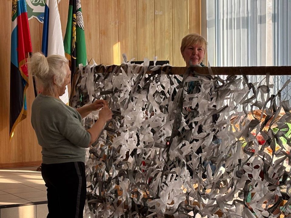 Ктото аккуратно отмеряет и нарезает ленты на раскройном столе, ктото готовит основу будущей сети, а другие вплетают полоски в ячейки. Эти сети используются для укрытия боевой техники и блиндажей — и женщины понимают, что в каждом узелке, в каждом вплетённом стежке заключена их забота, любовь и надежда на скорейшее возвращение наших ребят домой.