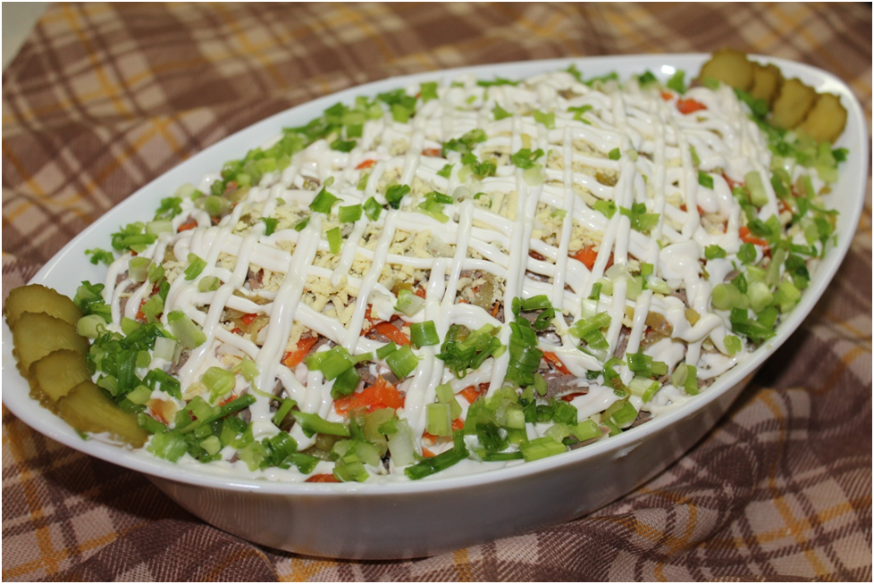6. По желанию, украсить зеленью, например, перышками зеленого лука. Готовый салат необходимо убрать в холодильник минимум на пару часов, чтобы он настоялся.