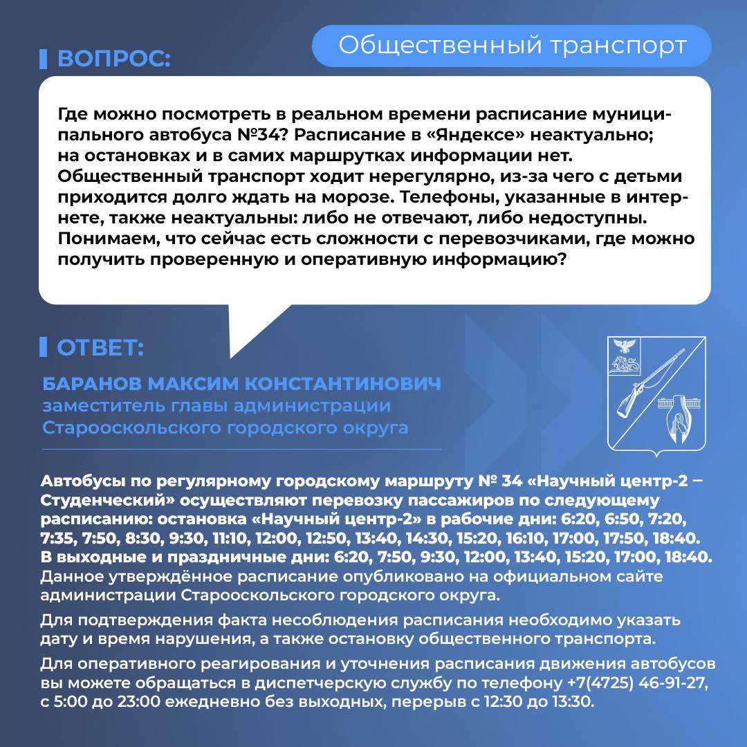 В частности, на прошлой неделе чаще всего спрашивали о следующем: маршрут №103 несколько дней выходил на линию с большими интервалами; поступали также обращения о расписании маршрута №34.