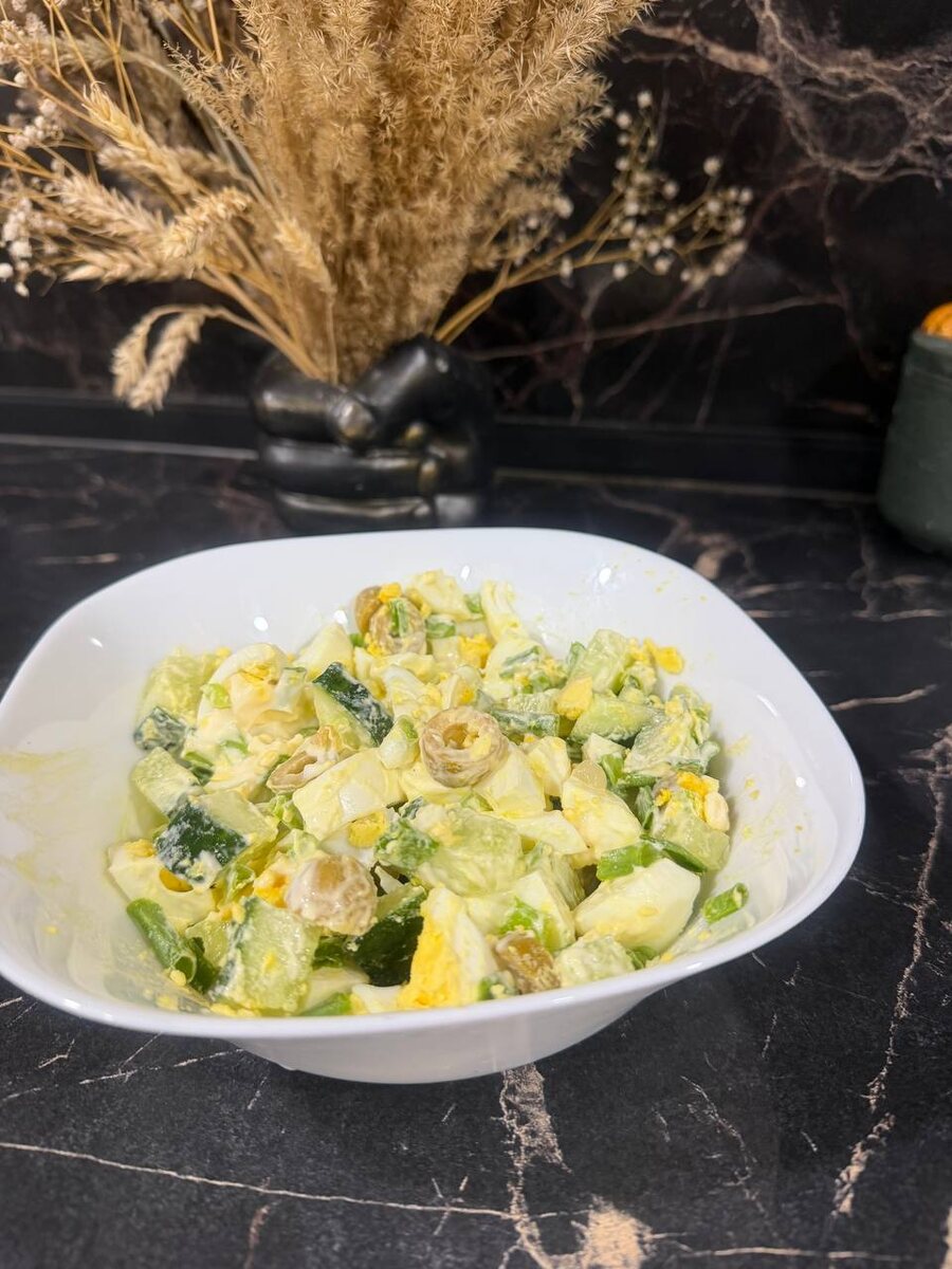 - В большой миске соединить все подготовленные ингредиенты: огурцы, яйца, зеленый лук и оливки.
