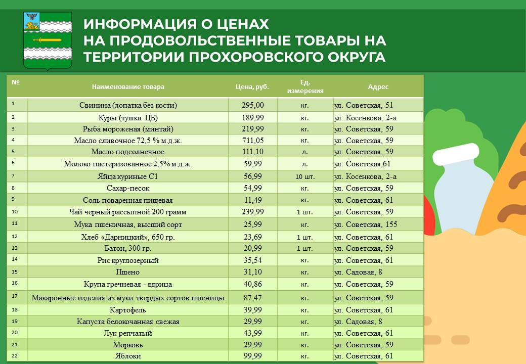 Администрация округа регулярно отслеживает цены в местных магазинах, чтобы вы могли делать покупки с максимальной выгодой. В данном обзоре представлена информация о товарах повседневного спроса по самым доступным ценам на территории нашего округа.