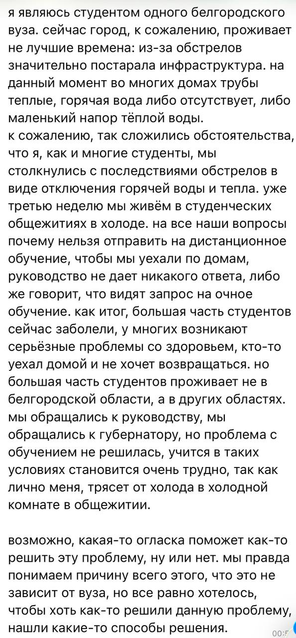 Второй день мне пишут студенты из Белгорода. В силу сложившейся сложной ситуации в регионе с подачей тепла и электричества, в ряде студенческих общежитий отсутствует отопление и горячая вода. В некоторых, по словам ребят, уже несколько недель. Иногородние студенты просят вузы перевести их на дистант, чтобы была возможность уехать домой на время и учиться оттуда. Но пока ответа они не получили