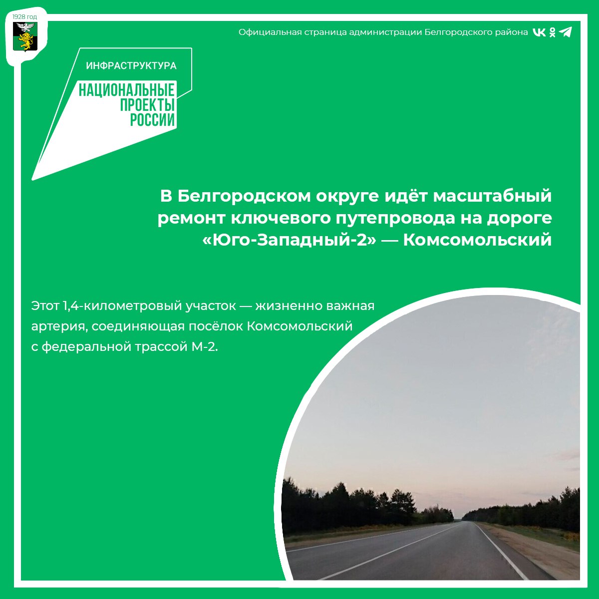 В Белгородском округе идёт масштабный ремонт ключевого путепровода на дороге «Юго-Западный-2» — Комсомольский