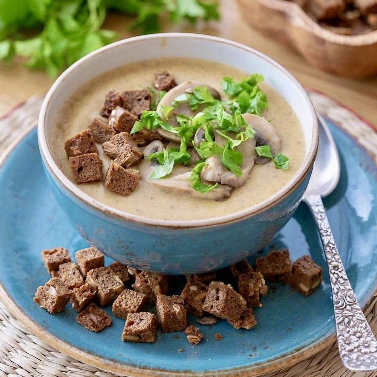 5. Подавайте суп горячим, украсив обжаренными грибочками, сухариками, свежей зеленью, а также кедровыми орешками или семечками, по вашему желанию!