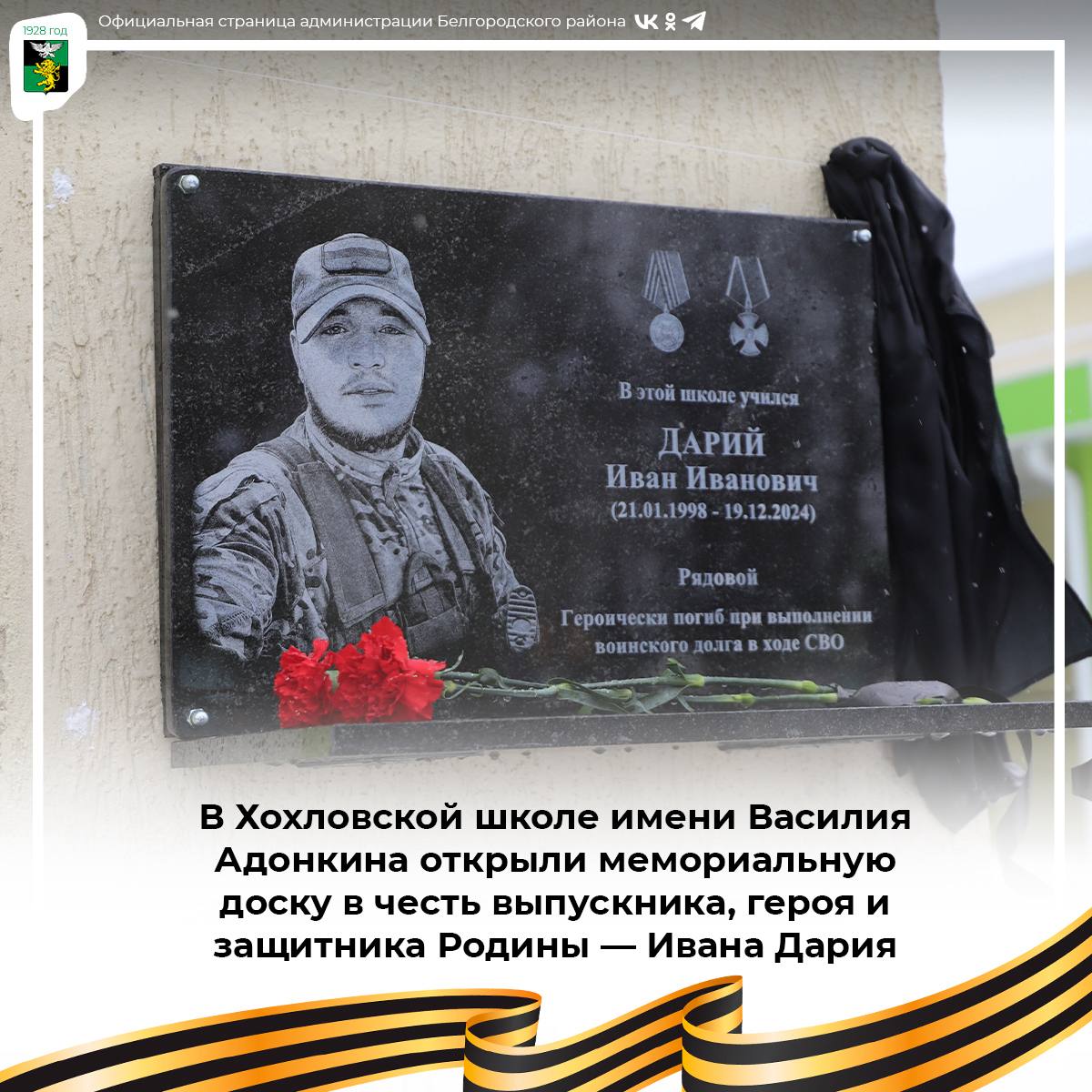 В Хохловской школе имени Василия Адонкина открыли мемориальную доску в честь выпускника, героя и защитника Родины — Ивана Дария