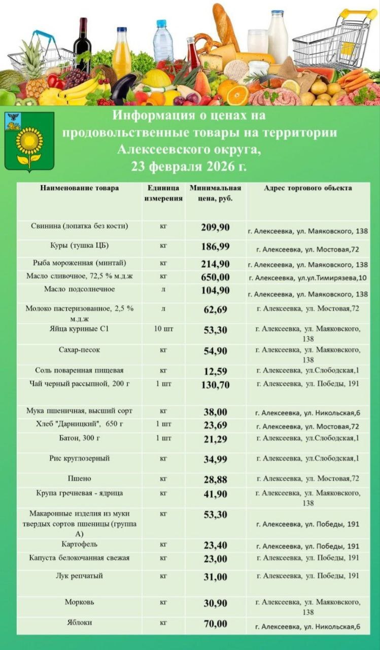 Представляем вашему вниманию обновлённый перечень минимальных цен на продовольственные товары в городе Алексеевка.