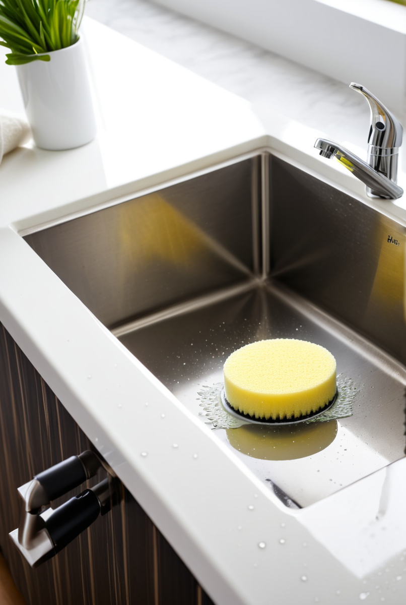 - Кухни: эффективно очищает плиты, раковины и кафель, освежая их внешний вид.