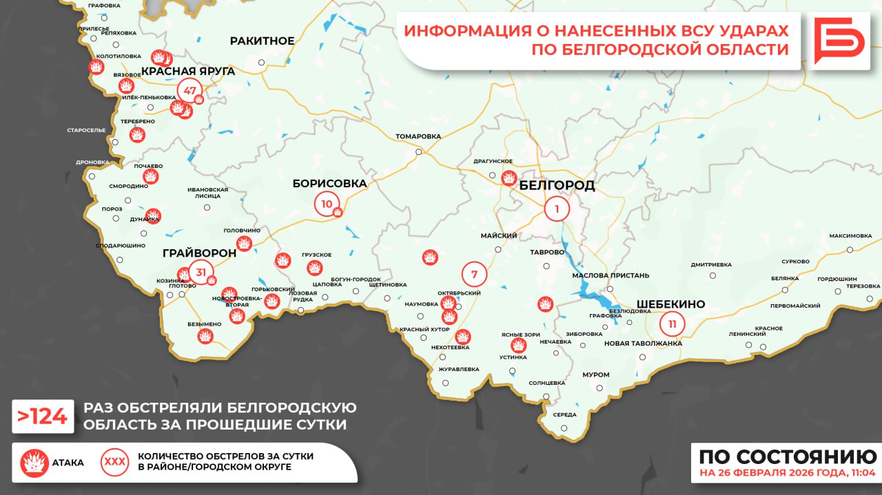 За прошедшие сутки ВСУ обстреляли Белгородскую область не менее 124 раз