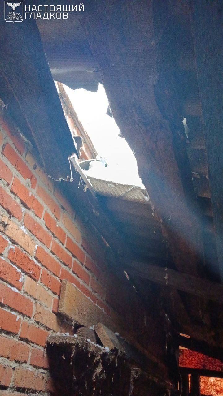 В Шебекинском округе город Шебекино подвергся атакам пяти беспилотников. Повреждены кровля надворной постройки (фото 1), кровля частного дома (фото 2), один легковой (фото 3) и три грузовых автомобиля (фото 4). В селе Графовка от удара беспилотника выбиты окна и посечён фасад частного дома.