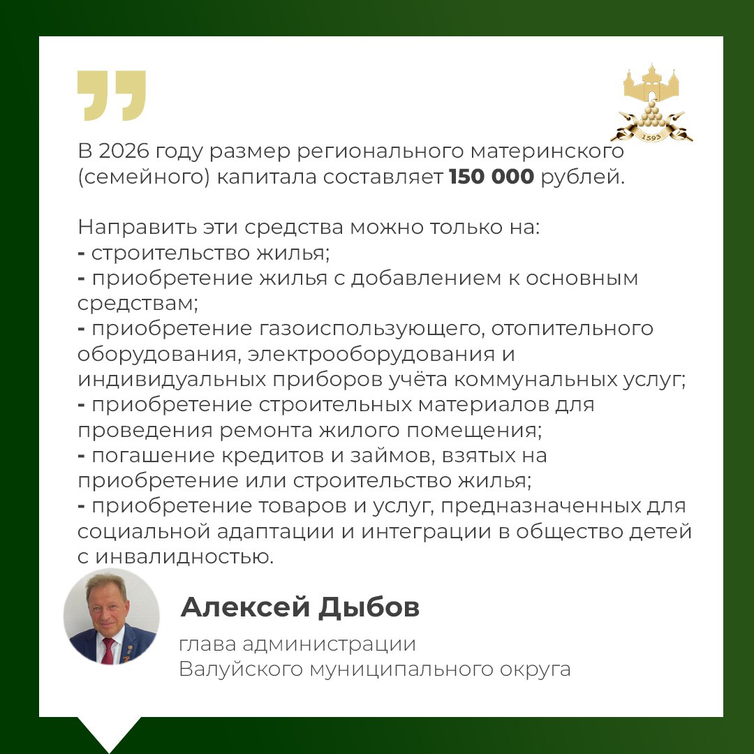 Глава администрации Валуйского муниципального округа Алексей Дыбов во время расширенного прямого эфира рассказал о размере регионального материнского капитала в 2026 году и о направлениях, на которые можно использовать эти средства.