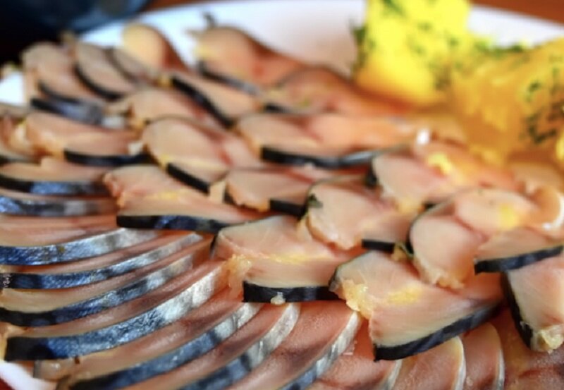 Утром извлеките рыбу из морозильника, дайте ей немного подтаять, но не до полной разморозки. Нарежьте рыбу тонкими ломтиками, толщиной не более 0,5 см, и разложите на тарелке. В качестве гарнира подойдут запеченный или отварной картофель, а также свежие овощи.
