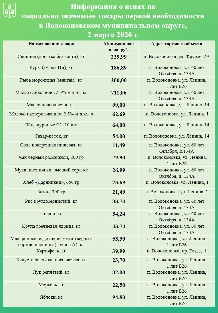 Уважаемые волоконовцы!. Информируем вас о ценах на продовольственные товары из базовой потребительской корзины, складывающихся в нашем муниципалитете на сегодняшний день