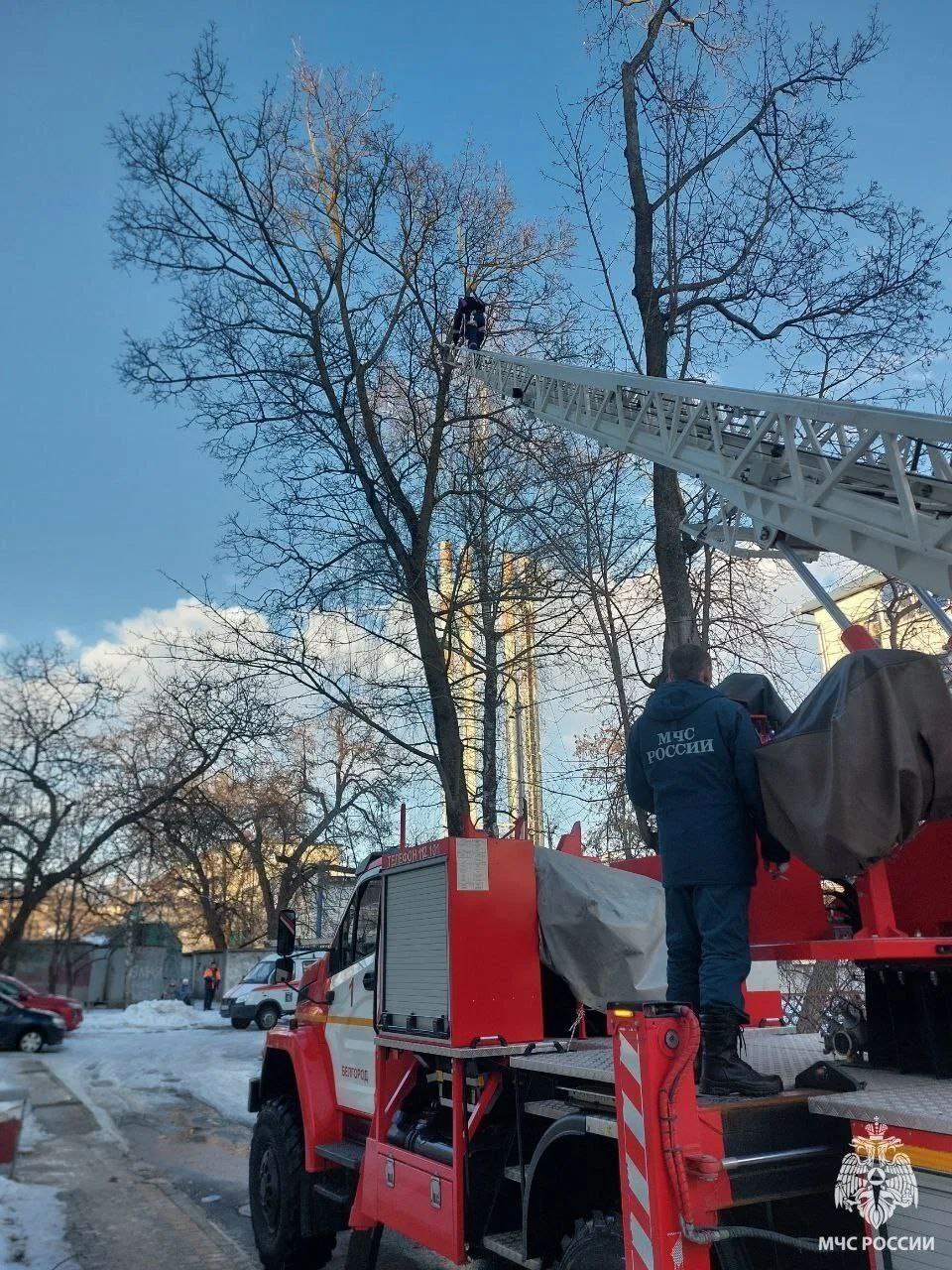Ещё один вызов поступил из Белгорода. На Садовой кот вскарабкался на высокое дерево, а обратно – не получилось. Пожарные пожарно-спасательной части №1 развернули автолестницу, и спасатель управления ГОЧС областного центра вернул кота на землю.