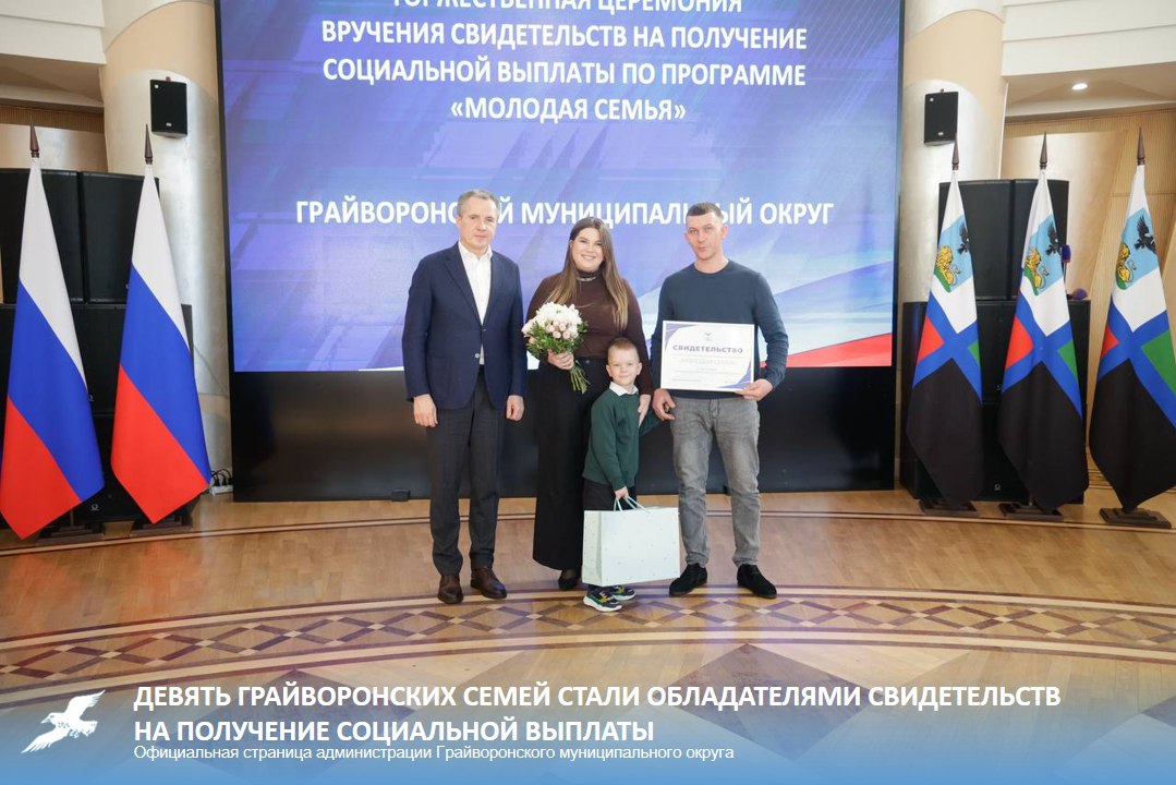 Девять семей из Грайворонского округа стали одними из 46 молодых пар региона, которые получили социальную выплату по программе «Молодая семья». Губернатор Вячеслав Гладков лично вручил им свидетельства на приобретение или строительство жилья.