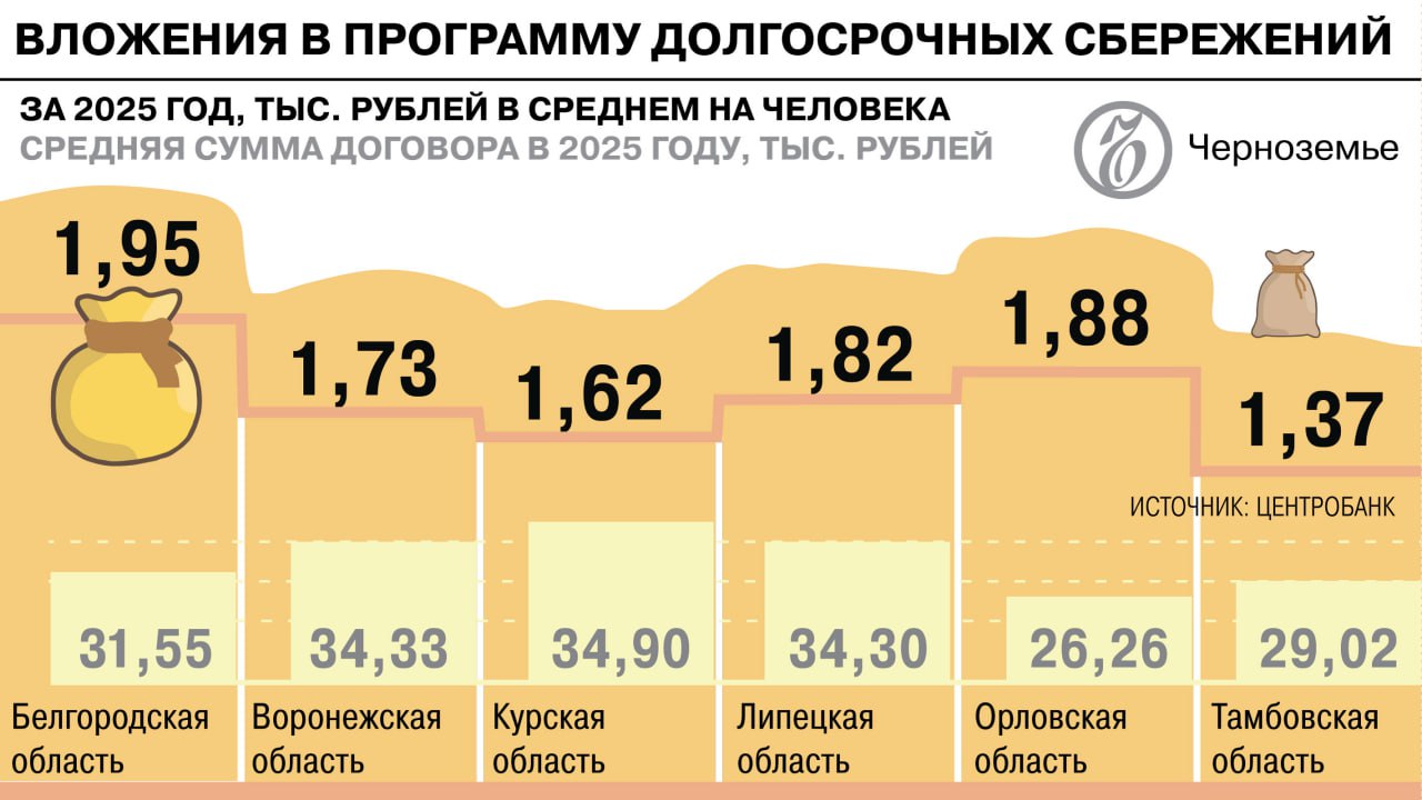В 2025 году к программе долгосрочных сбережений в регионах Черноземья присоединились 407 тыс. жителей, свидетельствуют данные Банка России. Сумма взносов в макрорегионе составила 13,1 млрд руб.— в два раза больше, чем за предыдущий год. Больше всех в программу внесли жители Воронежской области — 3,9 млрд руб. Участники рынка ожидают дальнейшего роста интереса к программе. Эксперты отмечают ускорение динамики вложений в ПДС в макрорегионе, но считают серьезным минусом инструмента «длительный срок без доступа к своим деньгам».