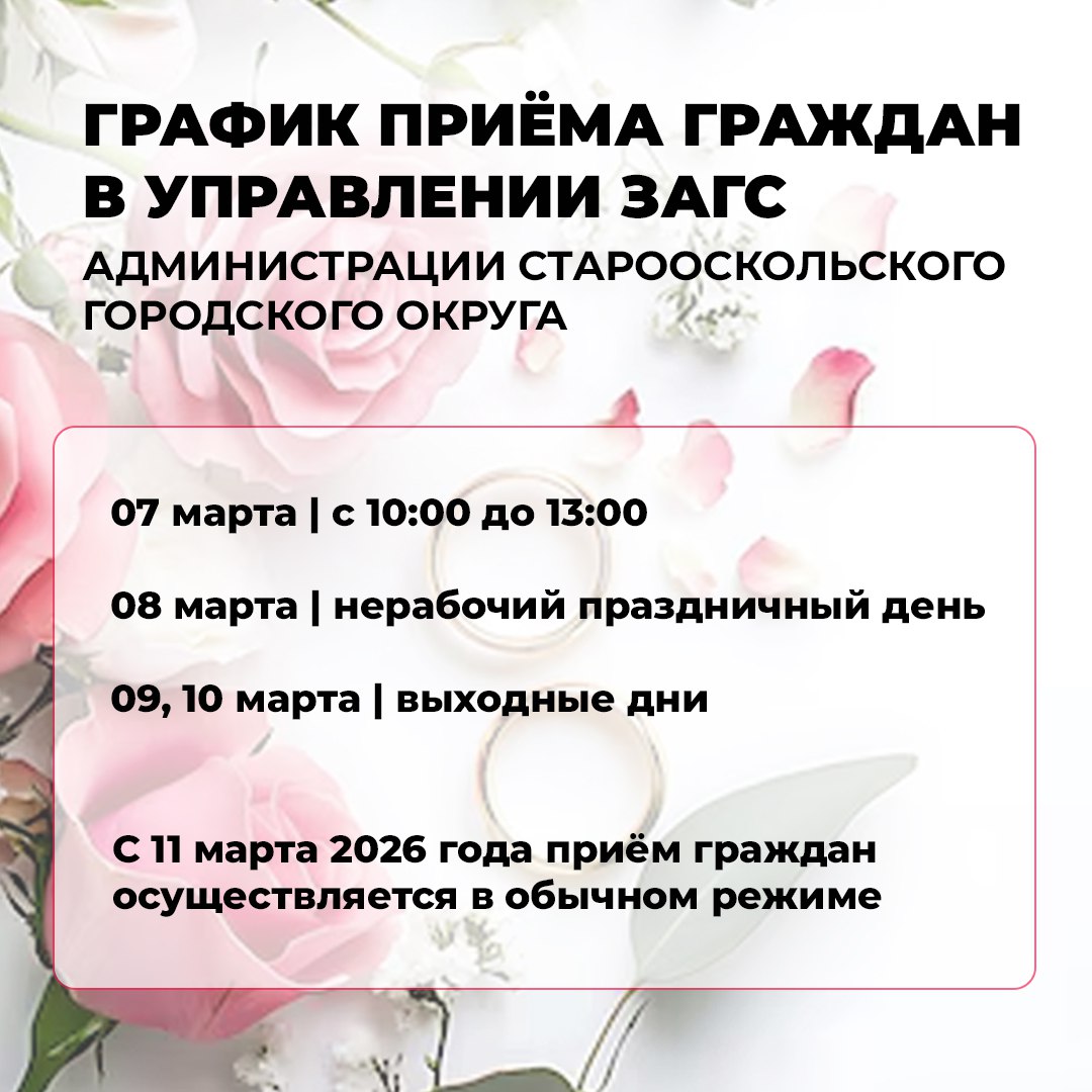 Уважаемые старооскольцы, информируем о графике приема граждан в управлении ЗАГС в праздничные дни.