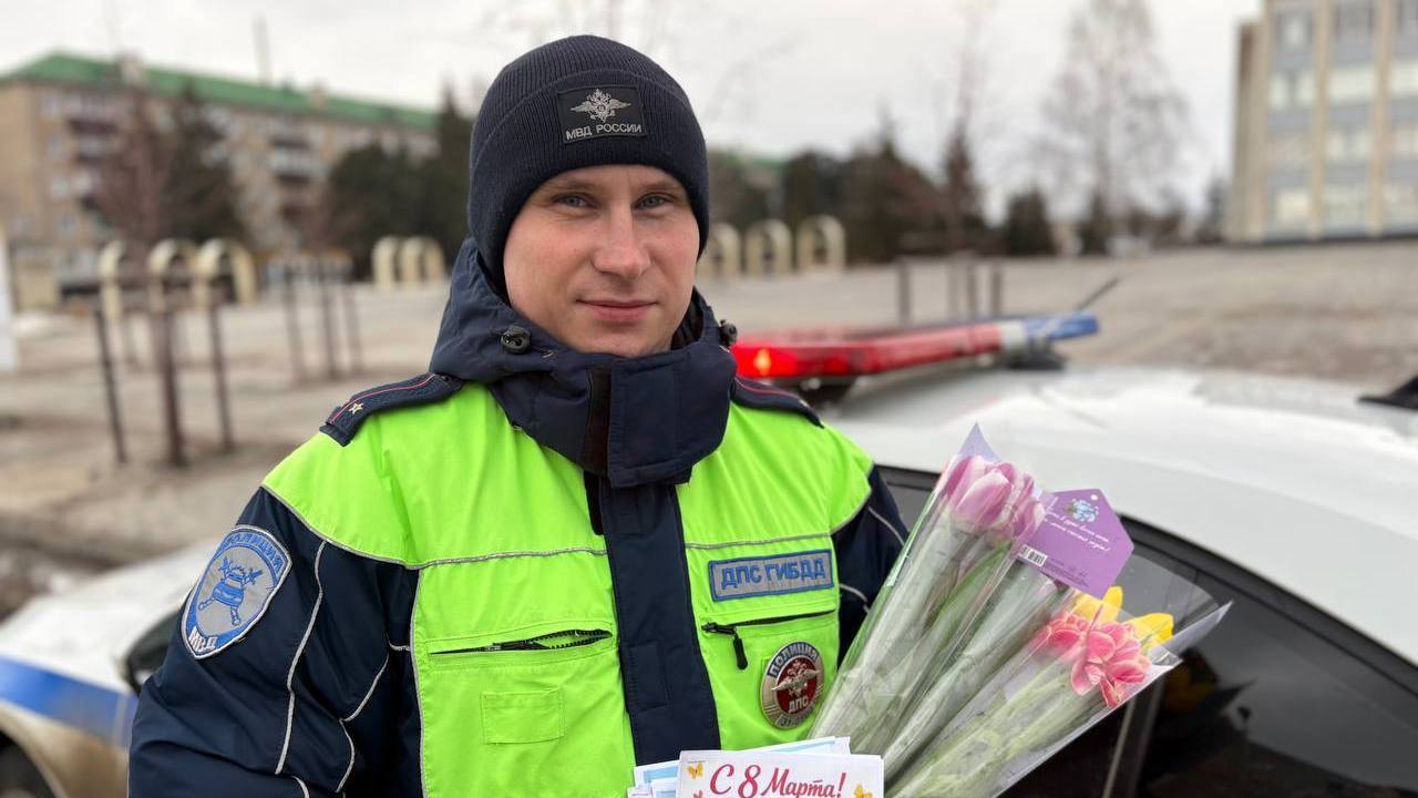 Женщинам за рулём дарят тюльпаны и открытки с 8 Марта, оформленные в виде «праздничных протоколов».