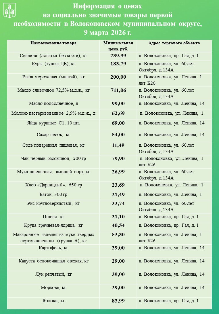 Уважаемые волоконовцы!. Информируем вас о ценах на продовольственные товары из базовой потребительской корзины, складывающихся в нашем муниципалитете на сегодняшний день