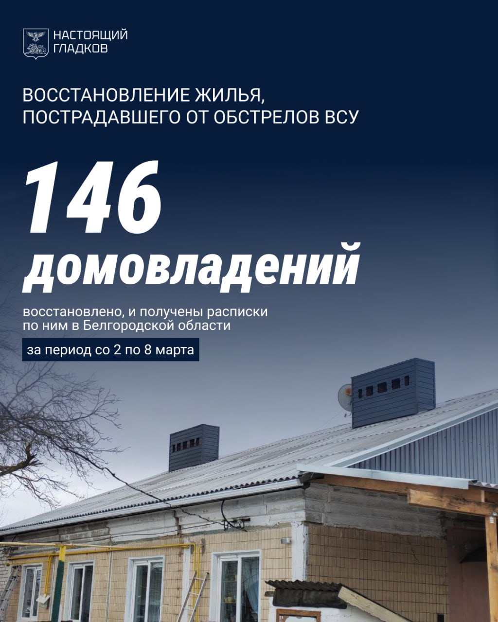 В Шебекинском округе завершили 39 объектов, закрыли контур на 1. За неделю выявлены 37 поврежденных домов и квартир, 35 автомобилей. Все счета, которые отдает администрация округа, оплачиваются. Результат восстановления не устраивает, — задача сдавать порядка 200 объектов в неделю. Также вечером жду доклад по замене антидроновой сетки на МКД.
