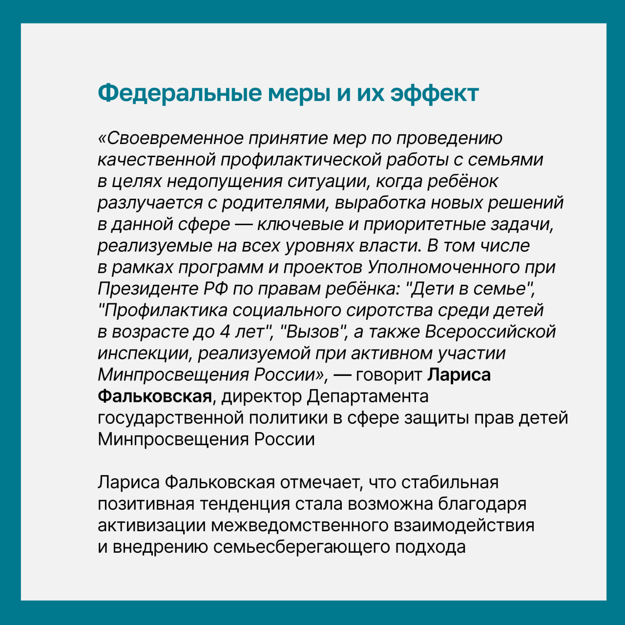Важную роль в улучшении ситуации сыграла системная работа федеральных органов — Минпросвещения России, федеральных министерств и ведомств, Уполномоченного при Президенте РФ по правам ребёнка Марии Львовой-Беловой. На это обратила внимание Лариса Фальковская, директор Департамента государственной политики в сфере защиты прав детей Минпросвещения России.