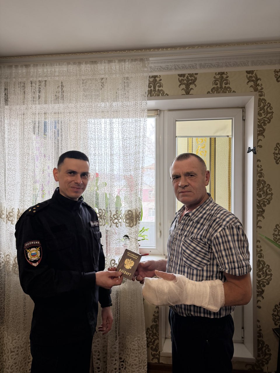 2 марта сотрудник отдела по вопросам миграции совершил выезд по месту проживания к жителю города Шебекино, пострадавшего в результате обстрела со стороны ВСУ, для выдачи паспорта гражданина Российской Федерации, взамен ранее испорченного паспорта в результате повреждения его осколком от взрыва дрона ВСУ. Андрей Владимирович провёл процедуру по выдаче паспорта, а также пожелал мужчине крепкого здоровья.